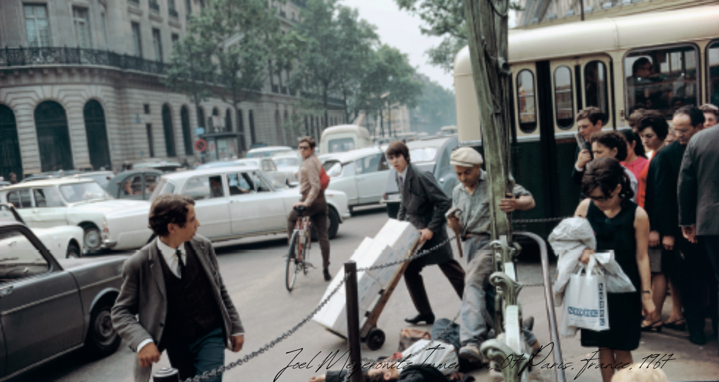 L'exposition Immersion, consacrée à Joel Meyerowitz à la Polka Galerie, propose une plongée directe dans le regard d'un photographe qui a fait de la rue son territoire d'observation privilégié. Parmi les images présentées, Paris, France, 1967 occupe une place singulière. On y voit un homme allongé sur le trottoir, tout juste tombé à la sortie du métro, tandis que les passants continuent leur chemin, entre surprise, indifférence ou simple hésitation. La scène semble prise sur le vif, dans un Paris dense et bruyant, où chaque geste se mêle au suivant sans jamais interrompre le rythme de la ville.
