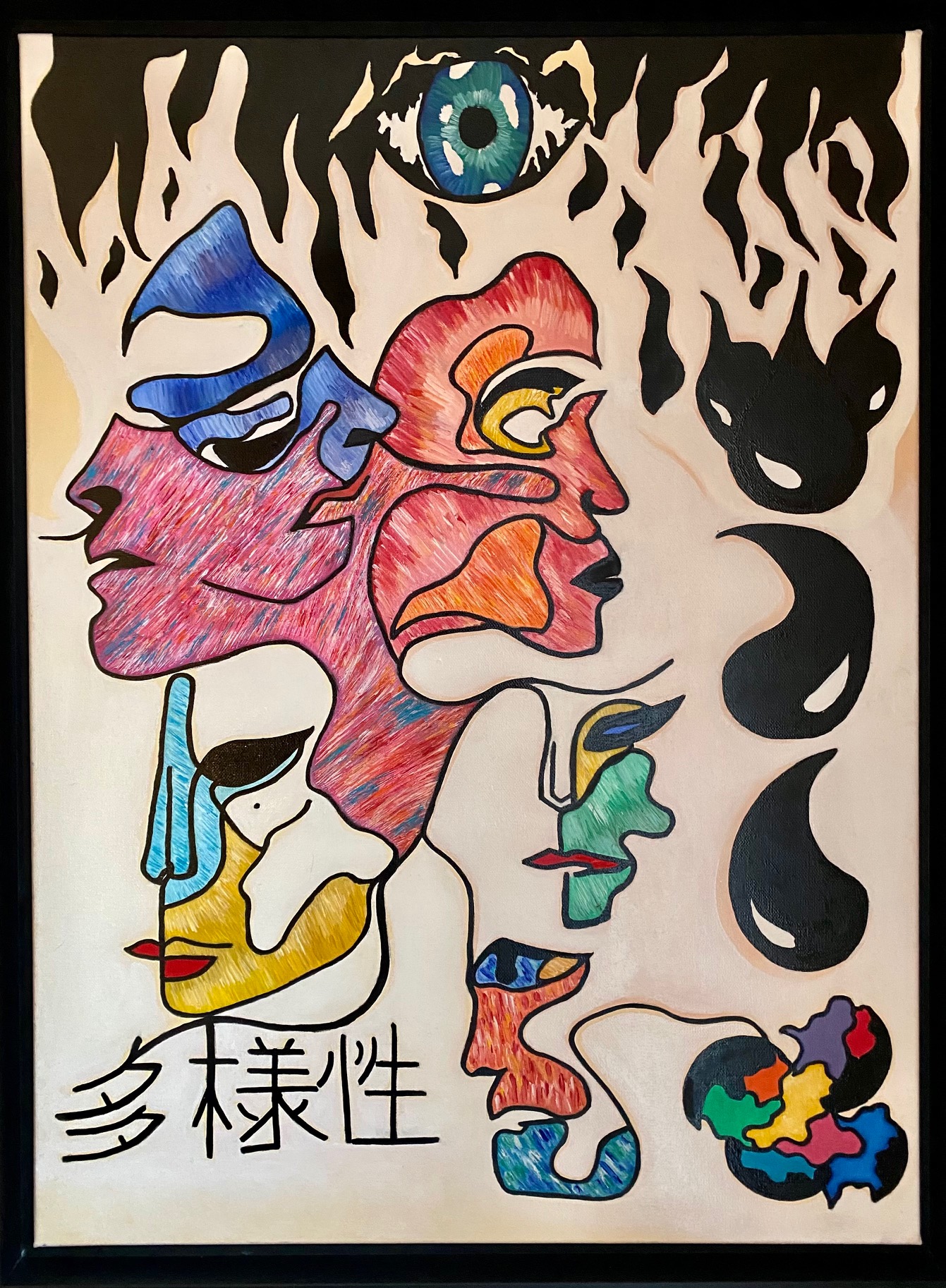 Faire passer un message de conscience. Conscience de soi, conscience de l'autre, conscience de quelque chose de plus grand que nous. C'est ce que symbolise aussi l'œil que l'on retrouve dans mes œuvres : non pas un regard de contrôle, mais un troisième œil, une ouverture vers l'univers et vers notre être intérieur.